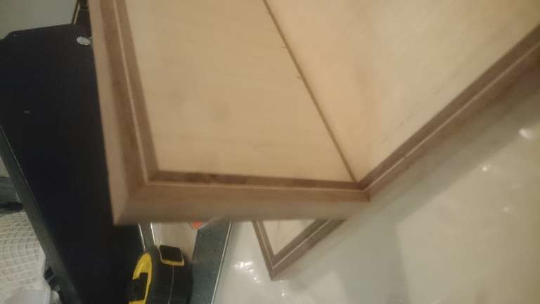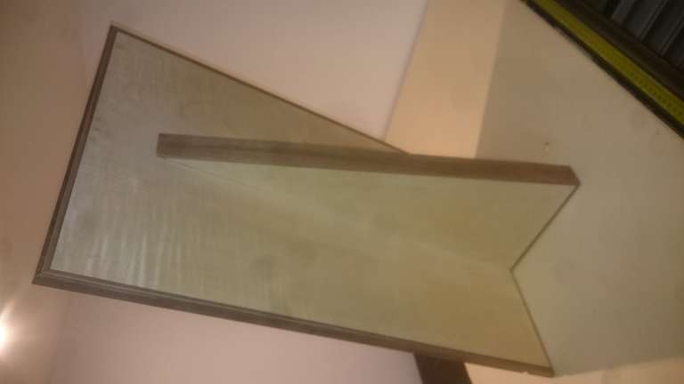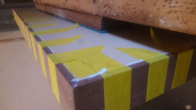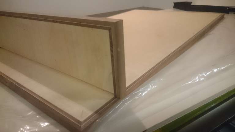 Giant Encyclopedia StandA giant book stand, created to order; only one piece madeA thin layer of wood veneer sandwiched between two strips of wallnutThe glue up of the stand on the backGlue up. Adding the fabricated trim to the board