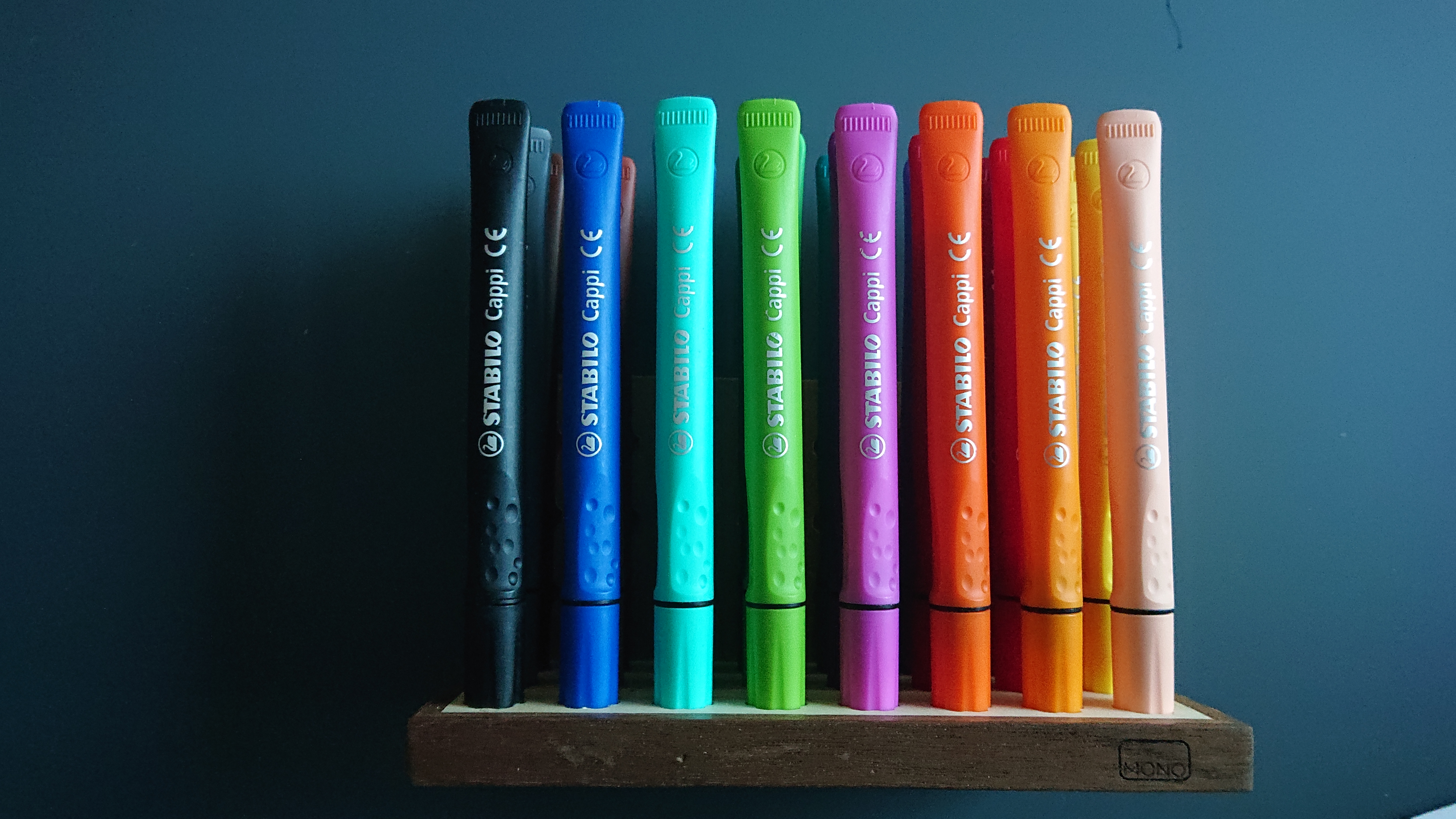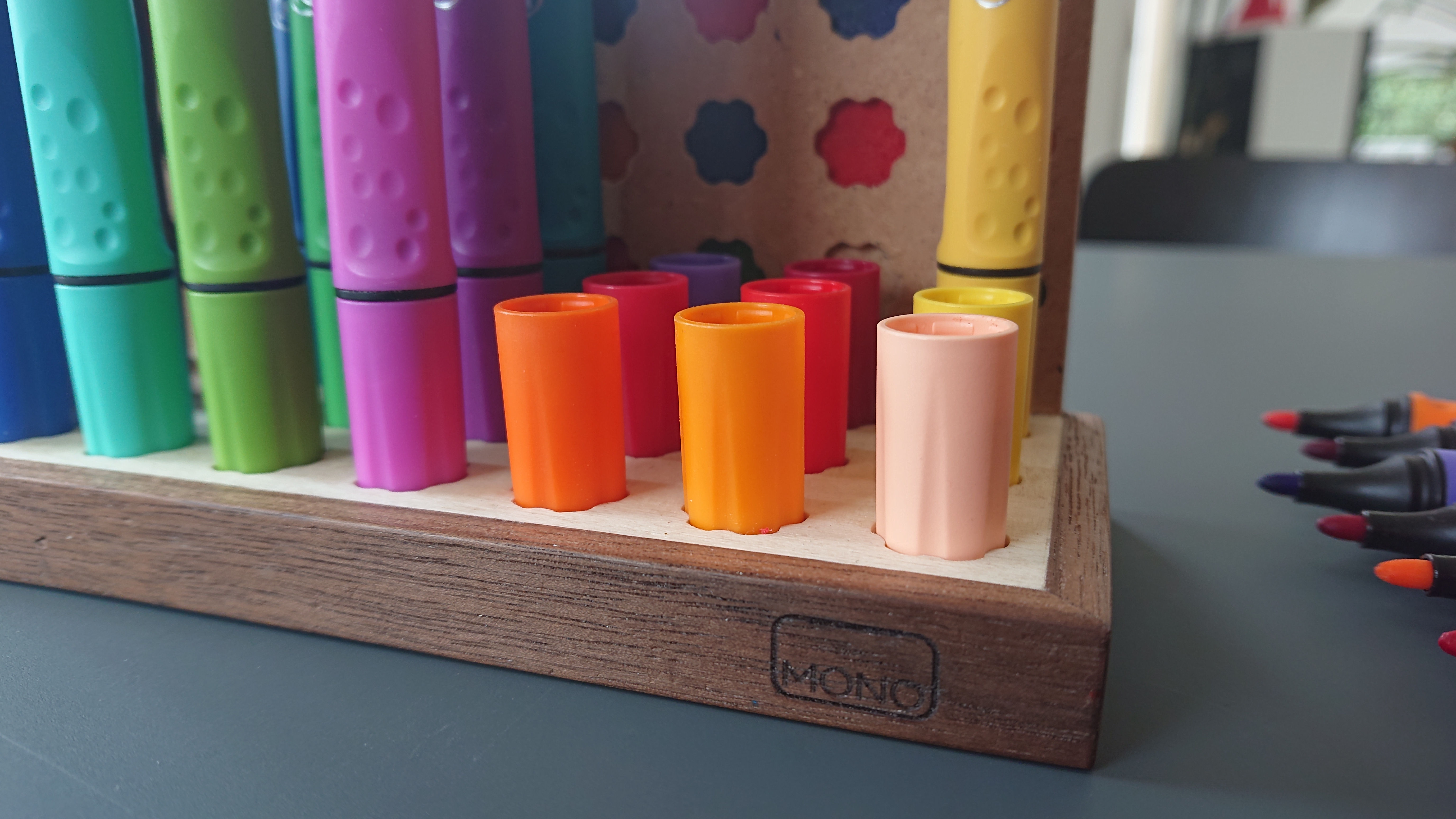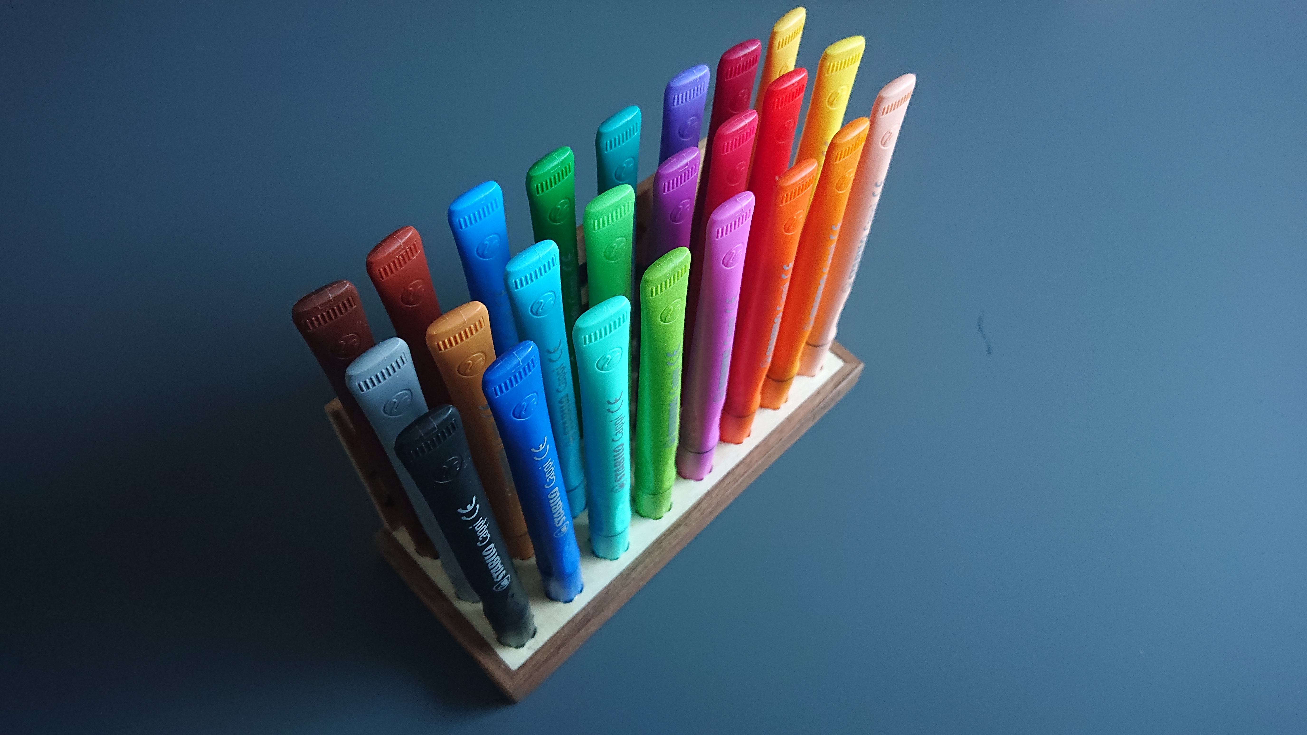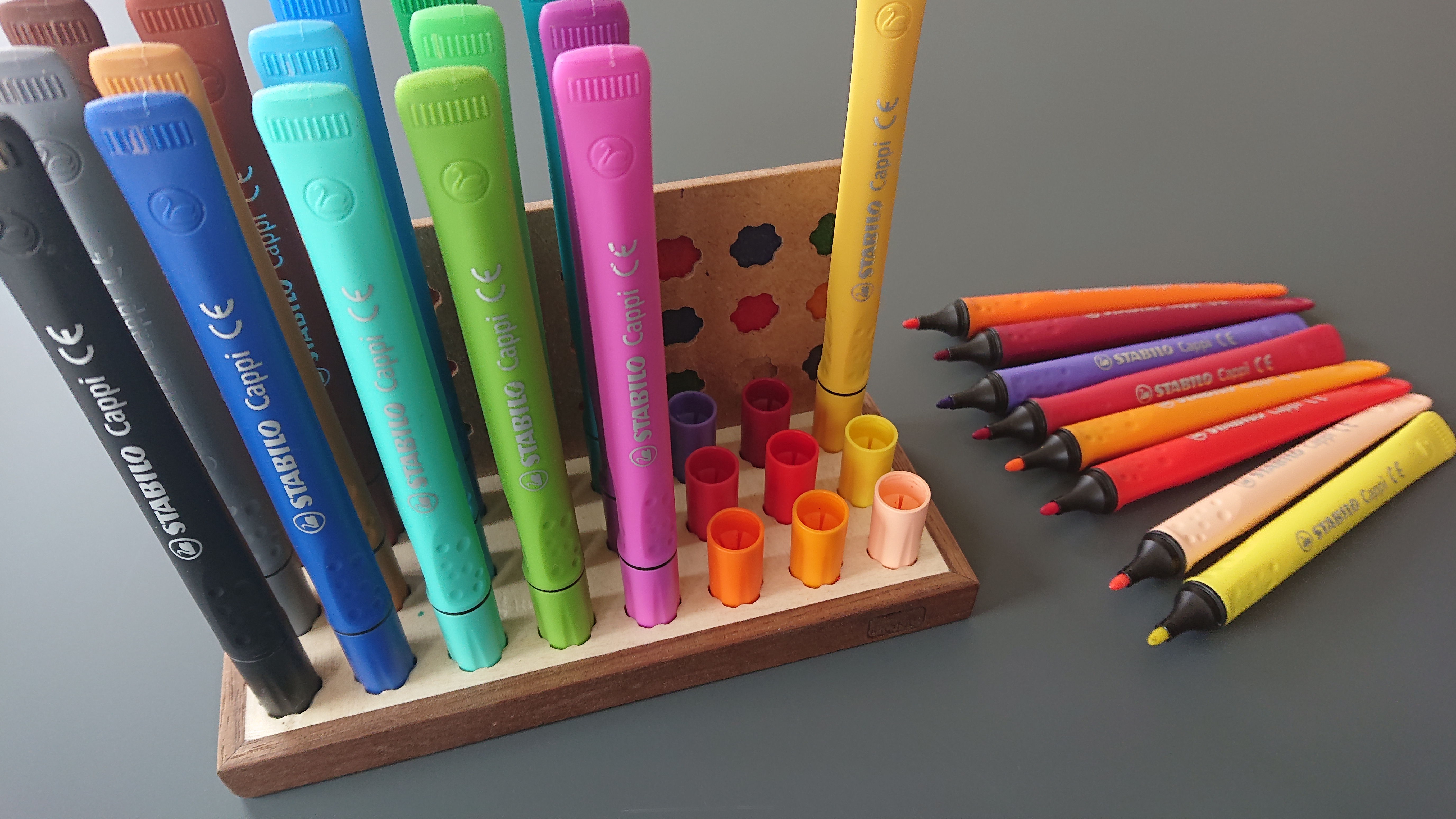 Precision CNC machined pen stand for 24 felt tip markers of the Stabilo brand. Marker type is "Cappi".